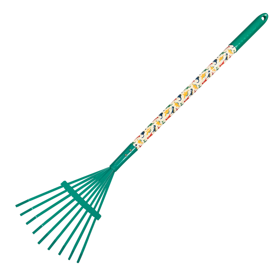Lapu un zāles grābeklis bērniem, zaļgans, 75 cm garš. Metāla grābeklis, koka kāts pārklāts ar PVC un plastmasas rokturi.