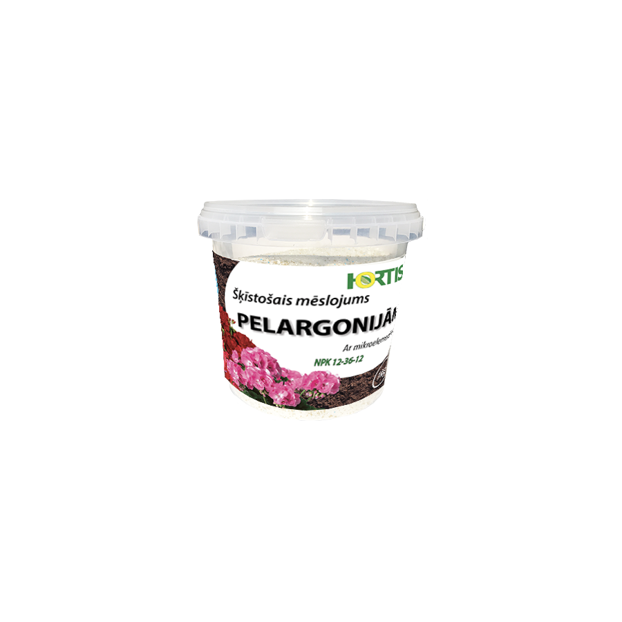 Ūdenī pilnīgi šķīstošs kompleksais minerālmēslojums, kas nodrošina pilnvērtīgu barības vielu kompleksu augiem viegli uzņemamā formā. HORTIS šķīstošais mēslojums pelargonijām 100% sastāv no augstvērtīgiem barības vielu elementiem, tas nesatur hloru un ir pilnīgi drošs augiem. Tas veicina augu optimālu augšanu un attīstību, sekmē ziedu veidošanos un bagātīgu augu ziedēšanu. Mēslojums nodrošina augu izturību mainīgos laikapstākļos, paaugstina to imunitāti. Izmantojams dārzkopībai, pelargoniju (ģerāniju) mēslošanai.