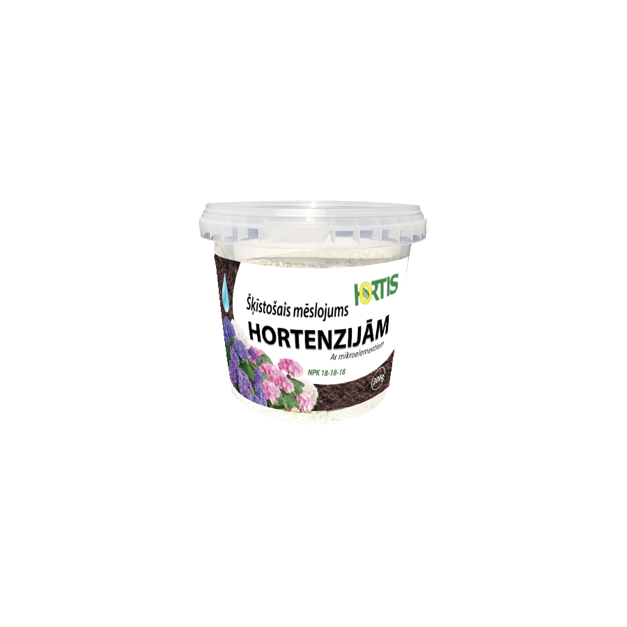 Ūdenī pilnīgi šķīstošs kompleksais minerālmēslojums, kas nodrošina pilnvērtīgu barības vielu kompleksu augiem viegli uzņemamā formā. HORTIS šķīstošais mēslojums hortenzijām 100% sastāv no augstvērtīgiem barības vielu elementiem, tas nesatur hloru un ir pilnīgi drošs augiem. Tas veicina augu optimālu augšanu un attīstību, sekmē ziedu veidošanos un bagātīgu augu ziedēšanu. Mēslojums nodrošina augu izturību mainīgos laikapstākļos, paaugstina to imunitāti, ziemcietību. Izmantojams dārzkopībā, hortenziju u.c. skābā augsnē augošu dekoratīvo krūmu mēslošanai.