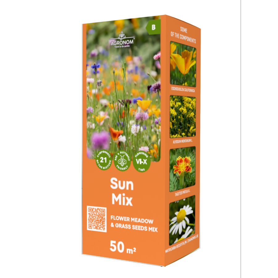 Ziedoša puķu pļava kastītē – piepildiet savu apkārtni ar lauka puķēm, izmantojot SUN maisījumu. Viegli audzējamu lielisku lauku puķu maisījums padarīs skaistāku dārzu un piesaistīs tik noderīgās bites un kukaiņus. Ar ziedošu pļavu var apzaļumot nogāzes un grūti pieejamas vietas zemes gabalā, kur mazāk tiek staigāts, lai radītu lauku vides sajūtu.Pļavas augu augstums: 20–60 cm. Pļavu nopļauj, kad pārziedējušas maisījumā esošās puķes.